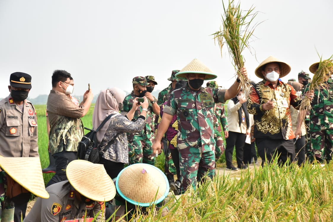 Bekasi, KompassIndonesiaNews.com, Kodam Jaya_Kabupaten Bekasi. Mendukung program pemerintah dalam swasembada pangan, Pangdam Jaya Mayjen TNI Untung Budiharto bersama Muspida Kabupaten Bekasi. Lakukan panen raya padi dan penanaman jagung perdana, di Desa Wanajaya Kecamatan. Cibitung. Kabupaten Bekasi. Kamis (31/3/2022).