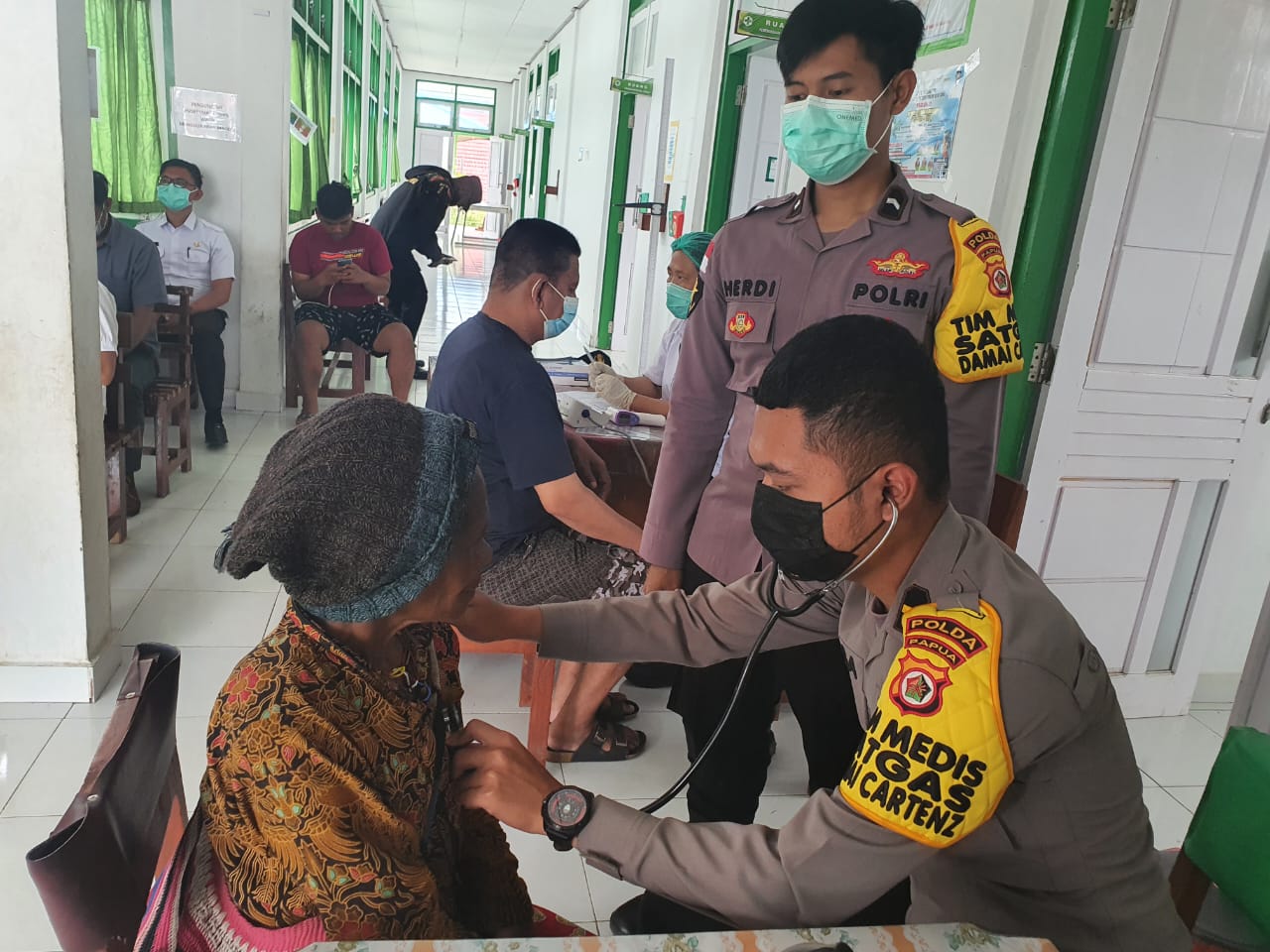 Pada kesempatan itu, tim medis Satgas Binmas, selain memberikan pelayanan kesehatan kepada masyarakat yang sakit, mereka juga melakukan anamnesis dan screening awal meliputi tensi, nadi, pernapasan, suhu.