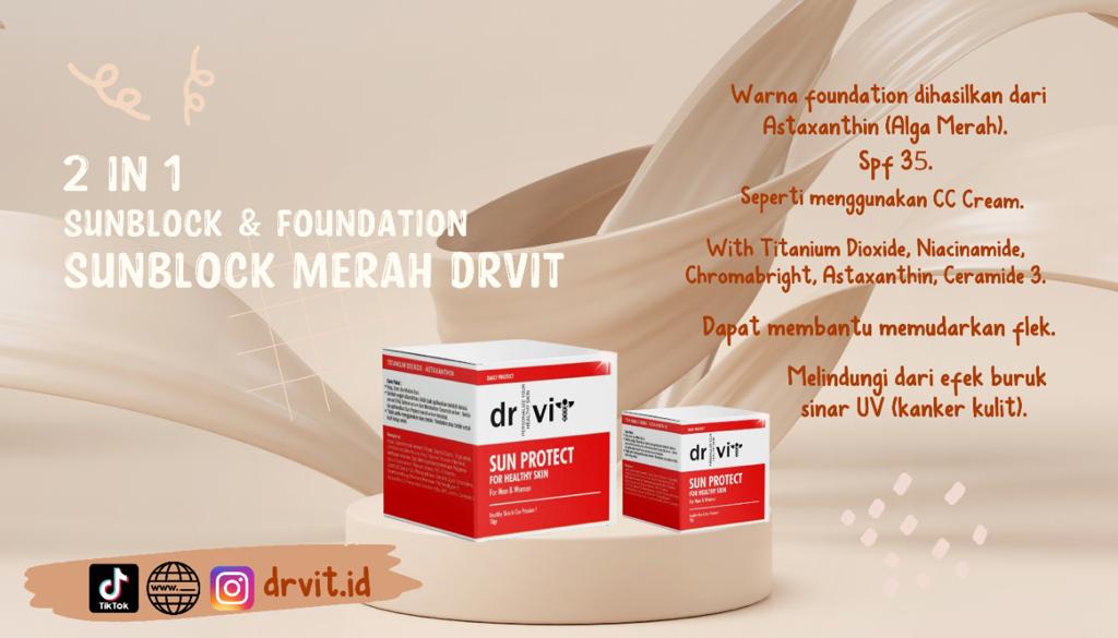 Seperti yang kita ketahui Astaxanthin atau alga merah ini memiliki kekuatan 6000x antioksidan lebih tinggi dari vitamin C, dengan menggunakan sunblock merah drvit ini kulit bukan hanya dilindungi dari efek buruk kanker namun juga dapat mencerahkan kulit dan membantu memudarkan flek diwajah, karena kandungan dalam sunblock merah drvit ini terdiri dari beberapa