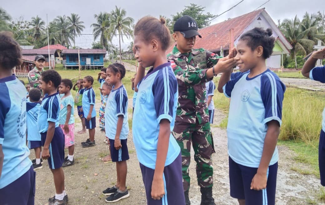 KompassIndonesianews Keerom -Satgas Yonif 143/TWEJ Pos Yabanda melaksanakan kegiatan belajar dan mengajar dengan memberikan materi Peraturan Baris Berbaris (PBB) kepada anak-anak SDN Inpres Yabanda di Kampung Yabanda, Distrik Yaffi, Kab. Keerom, Papua, Sabtu (4/3/2023).