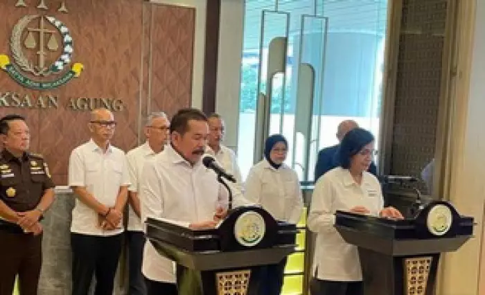 Foto: Konpers Menkeu dan Jaksa Agung mengenai laporan dugaan tindak pidana korupsi di LPEI, di Lobby Gedung Utama Kejagung, Senin (18/3/2024).
