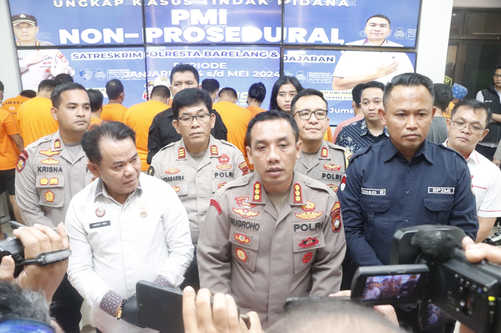BATAM, kompassindonesianews.com – Kapolresta Barelang Kombes Pol Dr. Nugroho Tri N, menggelar Konferensi Pers ungkap Pelaku Penempatan PMI Ilegal atau Non Prosedural yang di dampingi oleh Kepala BP3MI Kepulauan Riau Kombes Pol Imam Riyadi, Kepala Imigrasi Batam Samuel Toba, Kasat Polair Polresta Barelang I Gusti Bagus Krisna Fuady, Kasihumas Polresta Barelang AKP Tigor Sidabariba,  Kapolsek Kawasan Pelabuhan AKP Jaya Putra Tarigan, di Lobby Mapolresta Barelang. Jumat (31/05/2024)