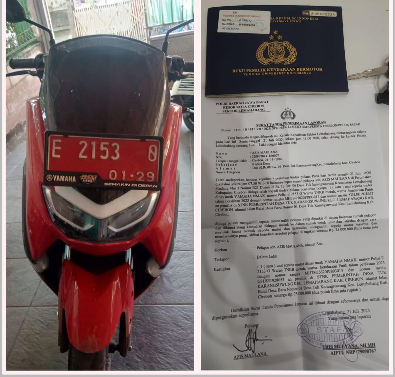 Kabupaten Cirebon – kompassindonesiaNews | Sudah satu minggu lebih, pasca kejadian pencurian sepedao motor ditempat kediaman Kepala Desa ( Kades ) atau Kuwu, Azis Maulana Desa Tuk Karangsuwung, Kecamatan Lemahabang, Kabupaten Cirebon, Provinsi Jawa Barat pada hari Senin ( 21/7/2025 ) sekitar pukul 02.28 WIB, kedua pelaku pencuri menggondol 1 (satu) Unit Sepeda Motor Dinas Yamaha NMX Nopol : E 2153 O, warna TNKB merah,Tahun perakitan 2023.(31/07/2025).