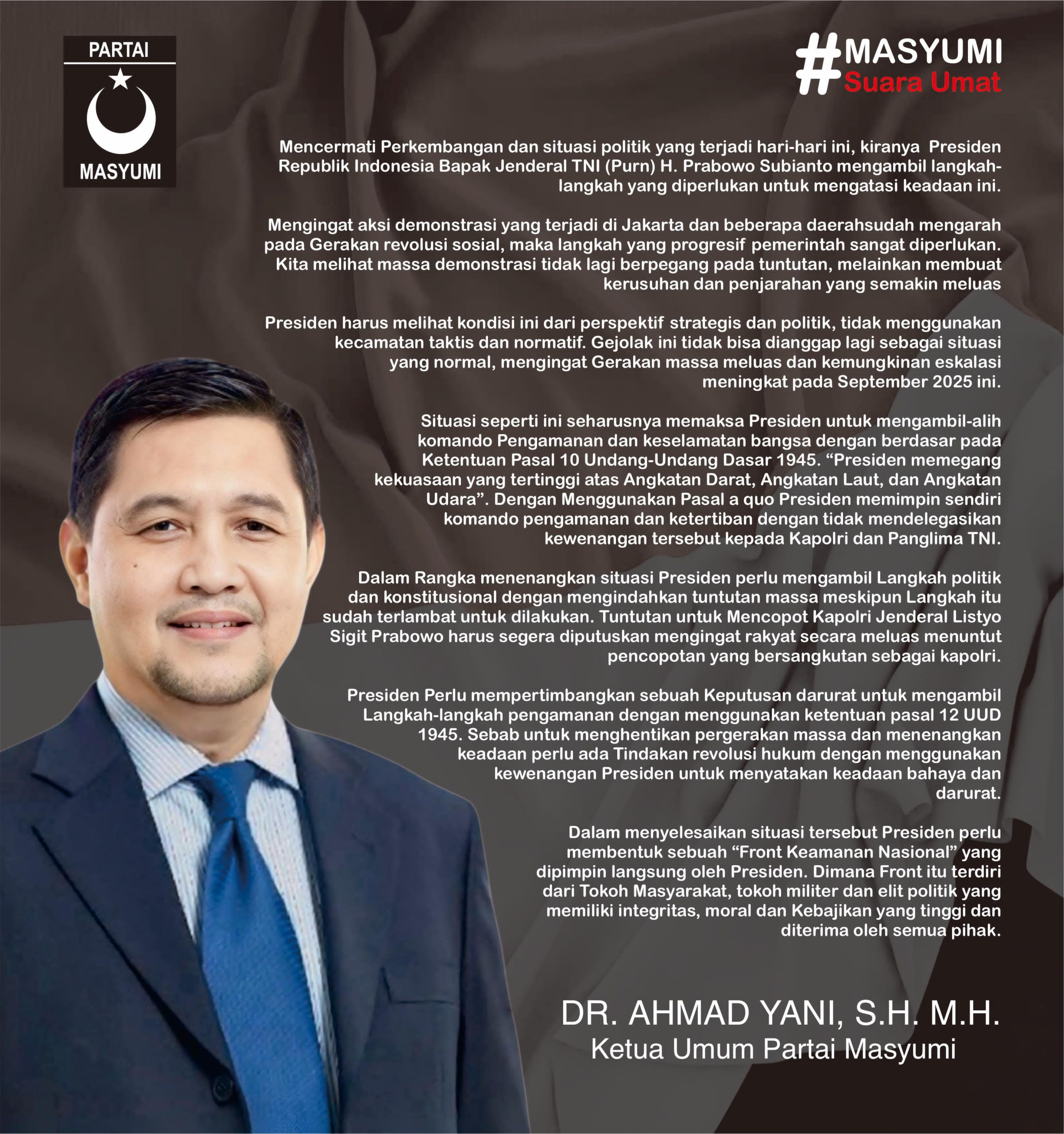 Jakarta, 31 Agustus 2025Kompassindonesianews.com  Menyikapi perkembangan situasi politik dan aksi demonstrasi yang terjadi di berbagai daerah, Ketua Umum Partai Masyumi, Dr. Ahmad Yani, S.H., M.H., mendesak Presiden Republik Indonesia Jenderal TNI (Purn.) H. Prabowo Subianto untuk segera mengambil langkah-langkah tegas dan progresif dalam mengatasi keadaan.