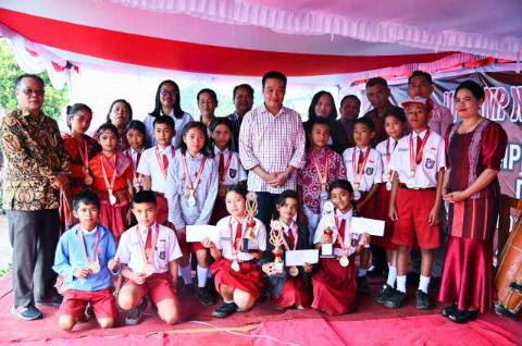 Bupati Humbang Hasundutan, Oloan Paniaran Nababan, didampingi Kepala Dinas Pendidikan Martahan Panjaitan serta Asisten III Jaulim Simanullang, Kepala Dinas Kominfo Adrianus Mahulae,menyerahkan piagam penghargaan dan piala kepada 15 siswa-siswi peraih juara Olimpiade MIPA tingkat Sekolah Dasar (SD).