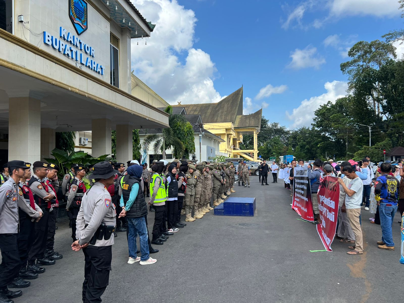 Sejak pagi hari, suasana di sekitar kantor Pemkab Lahat telah dipadati oleh personel gabungan dari Polres Lahat, Polsek Merapi, dan Polsek Kota Lahat. Pengamanan dipimpin oleh Kasat Samapta AKP Heri Irawan, SE., MM., didampingi Kapolsek Kota Lahat AKP Edy Surisno, SH., serta Kapolsek Merapi Barat Iptu Candra Kirana, SH., MM. Kehadiran aparat bukan untuk membatasi, melainkan memastikan bahwa suara rakyat dapat tersampaikan dalam suasana aman dan tertib.